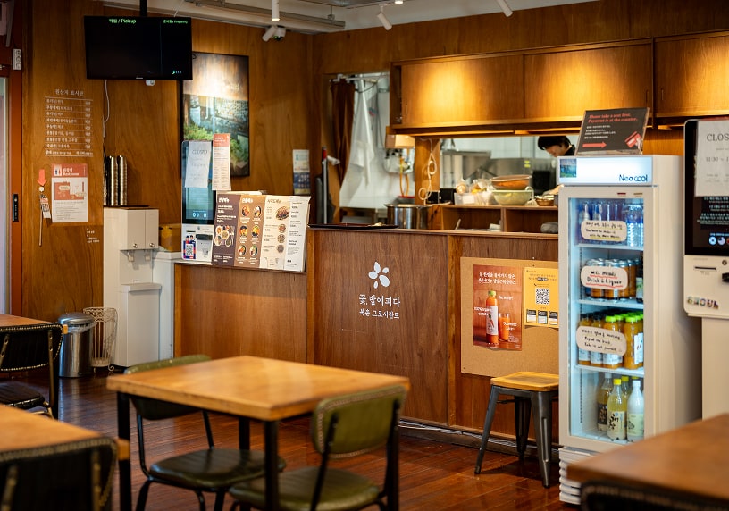 한식 비빔밥 한상을 맛볼 수 있는 레스토랑과 전통장, 비건 식품, 밀키트, 전통주, 반찬, 과일, 채소, 쌀 등 무농약, 유기농 친환경 식재료를 구매할 수 있는 그로서리가 함께 있습니다.